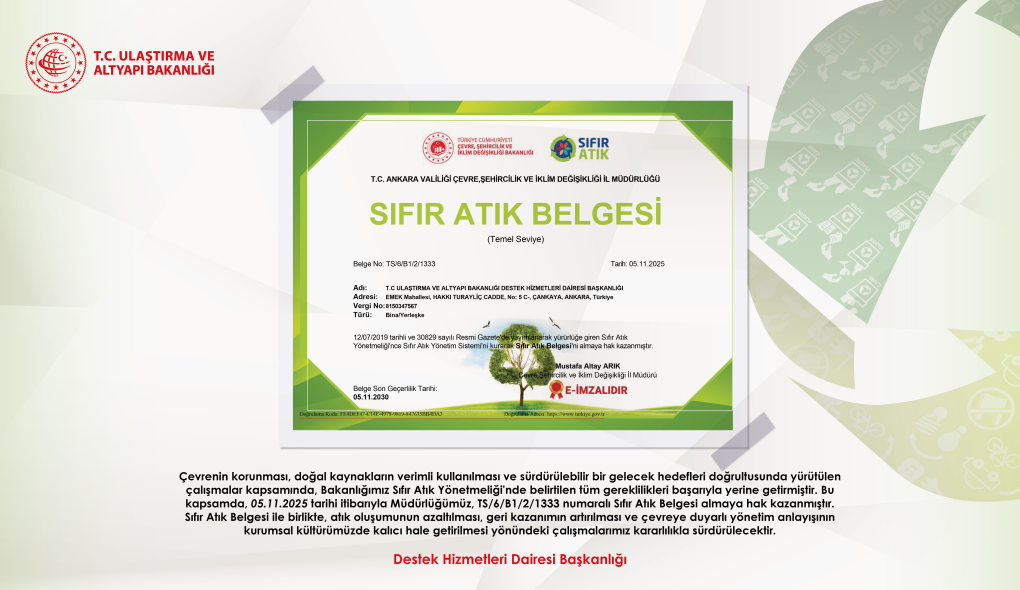 Çevrenin korunması, doğal kaynakların verimli kullanılması ve sürdürülebilir bir gelecek hedefleri doğrultusunda yürütülen çalışmalar kapsamında, Bakanlığımız Sıfır Atık Yönetmeliği'nde belirtilen tüm gereklilikleri başarıyla yerine getirmiştir. Bu kapsamda, 05.11.2025 tarihi itibarıyla Müdürlüğümüz, TS/6/B1/2/1333 numaralı Sıfır Atık Belgesi almaya hak kazanmıştır. Sıfır Atık Belgesi ile birlikte, atık oluşumunun azaltılması, geri kazanımın artırılması ve çevreye duyarlı yönetim anlayışının kurumsal kültürümüzde kalıcı hale getirilmesi yönündeki çalışmalarımız kararlılıkla sürdürülecektir.